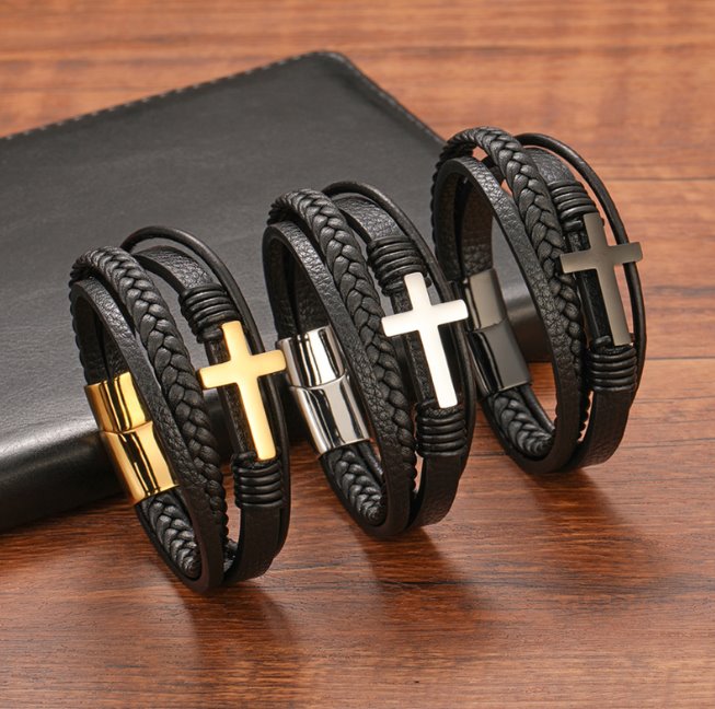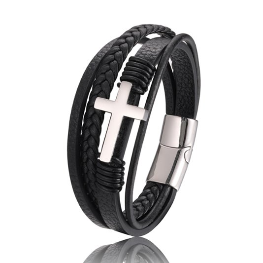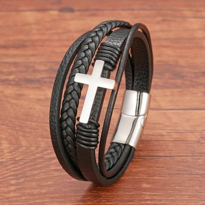 Elegancka Bransoletka Męska Skórzana z Krzyżem.