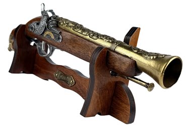 Replika pistoletu kapiszonowego z XVIII wieku na drewnianym stojaku. Prezentowana replika bardzo dokładnie odzwierciedla oryginał. W całości wykonana z metalu oraz drewna. Metalowe wykończenia oraz lufa odlane ze zdobieniami charakterystycznymi dla epoki