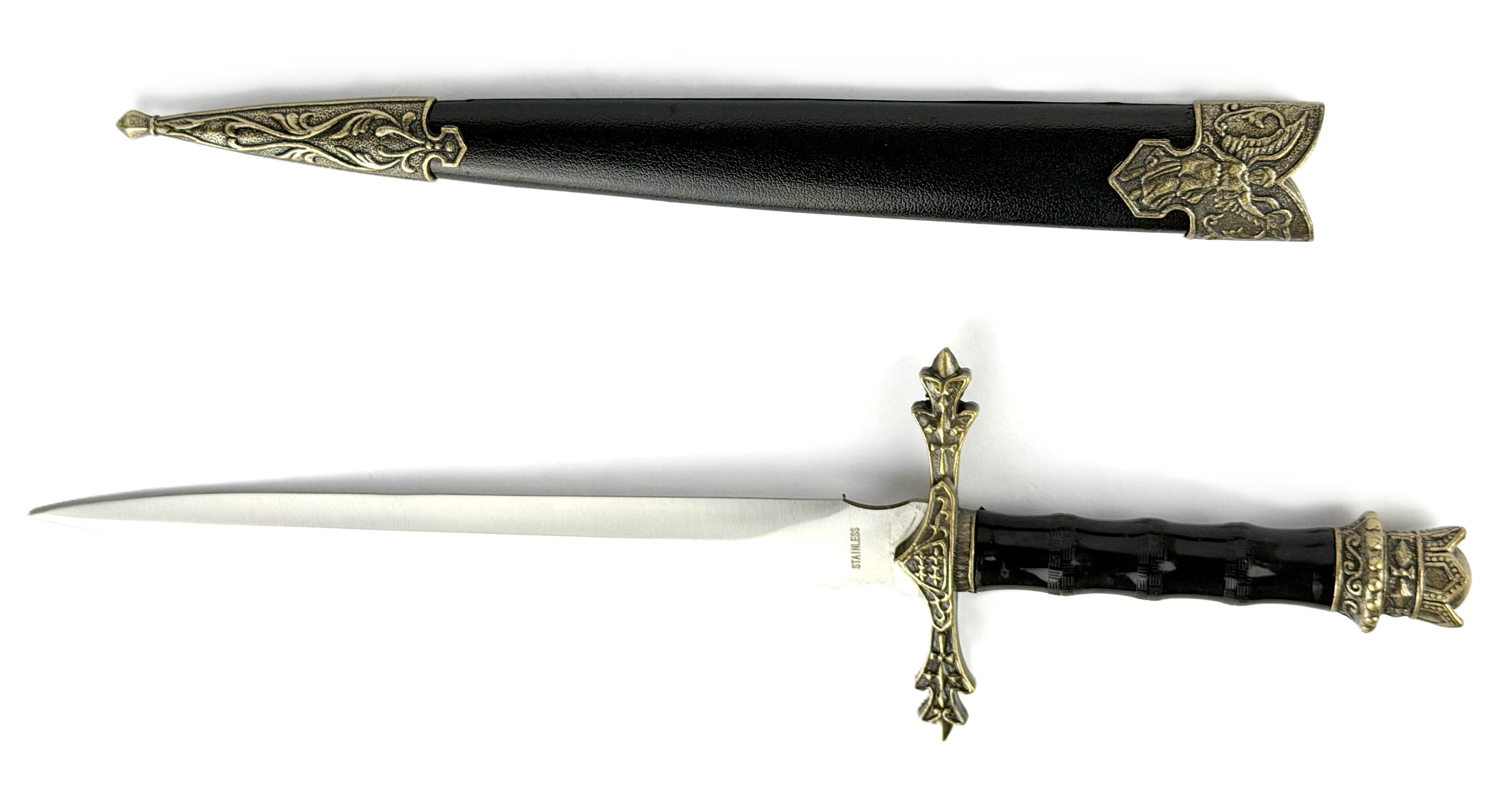 Wysoka jakość i design: Sztylet wykonano ze stali nierdzewnej, co gwarantuje trwałość i elegancki wygląd. Do zestawu dołączono ozdobną pochwę, która podkreśla jego unikalny charakter.