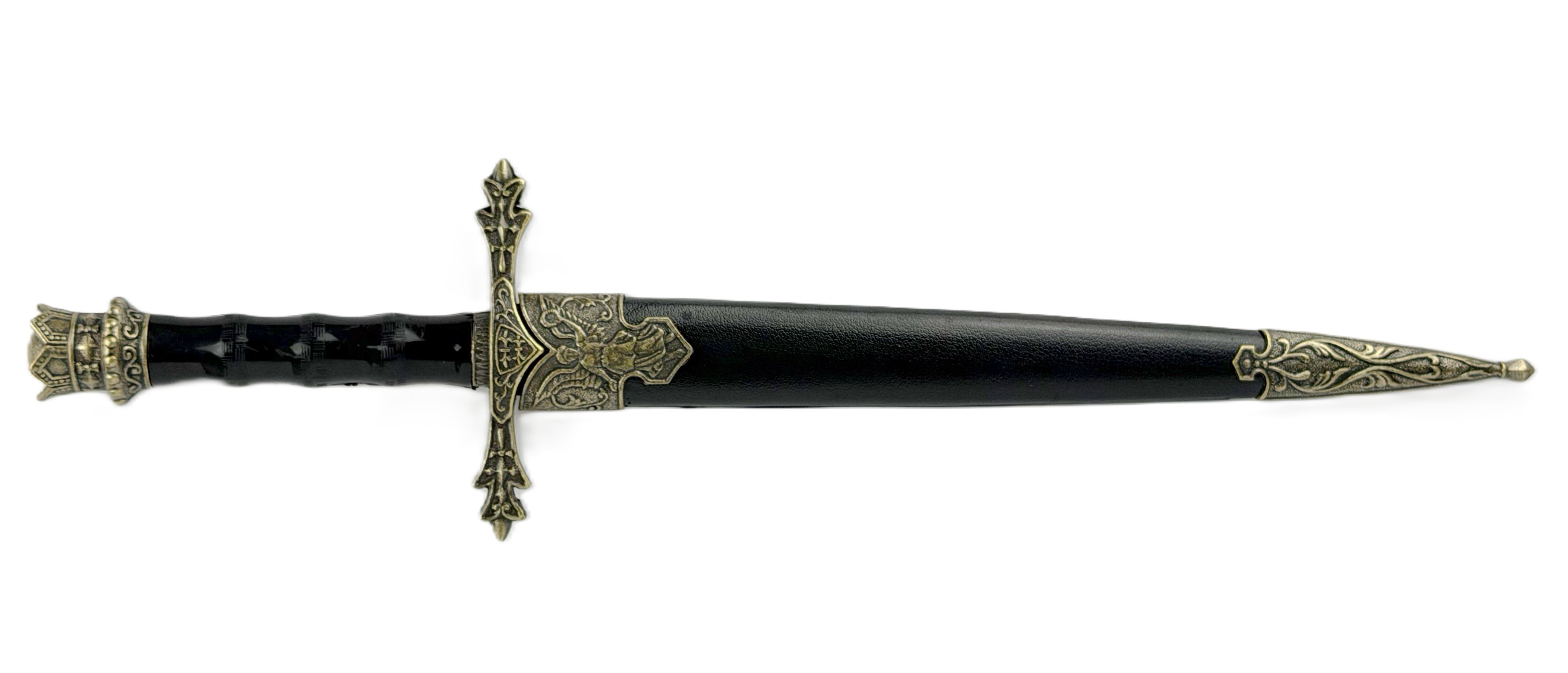 Replika średniowiecznego sztyletu rycerskiego w pochwie - przedmiot dekoracyjny. Ten sztylet rycerski to dekoracyjna replika średniowiecznej broni, która przeniesie Cię w czasy rycerzy i zamków. Wykonany z dbałością o detale, będzie ozdobą, która zachwyci każdego miłośnika historii i militariów.